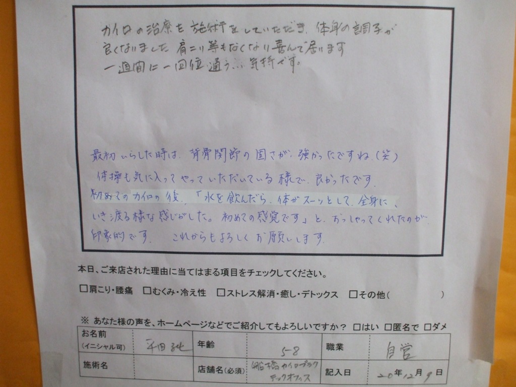 『カイロの治療を施術をしていただき、身体の調子が良くなりました。