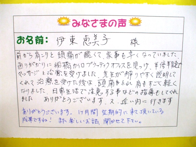 通りがかりに船橋カイロプラクティックオフィスを見つけ半信半疑で治療を受けました。